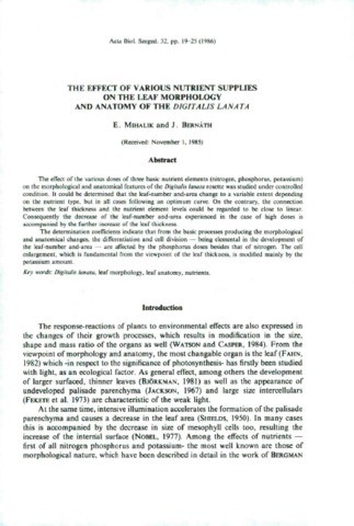 Mihalik Erzsébet; Bernáth Jenő: The effect of various nutrient supplies on the leaf morphology and anatomy of the Digitalis lanata. In: Acta biologica, (32) 1-4. pp. 19-25. (1986)