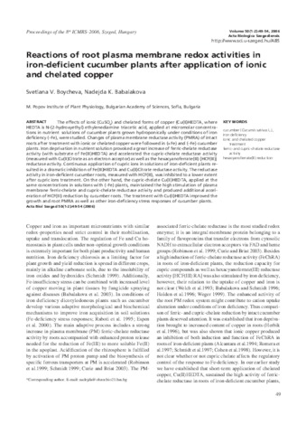 Boycheva Svetlana V.; Babalakova Nadejda K.: Reactions of root plasma membrane redox activities in iron-deficient cucumber plants after application of ionic and chelated copper. In: Acta biologica Szegediensis, (50) 1-2. pp. 49-54. (2006)