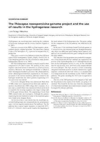 Palágyi-Mészáros Lívia: The Thiocapsa roseopersicina genome project and the use of results in the hydrogenase research. In: Acta biologica Szegediensis, (50) 3-4. p. 169. (2006)