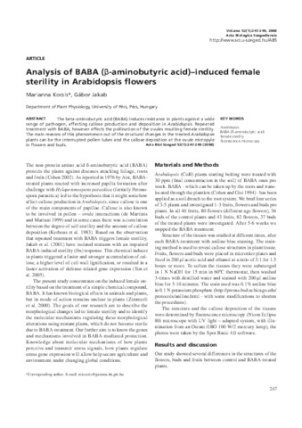 Kocsis Marianna; Jakab Gábor: Analysis of BABA (β-aminobutyric acid)-induced female sterility in Arabidopsis flowers. In: Acta biologica Szegediensis, (52) 1. pp. 247-249. (2008)
