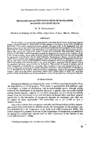 Mstislavskiy M. M.: Regularities in the formation of manganese deposits on continents. In: Acta mineralogica-petrographica, (28). pp. 21-35. (1986)