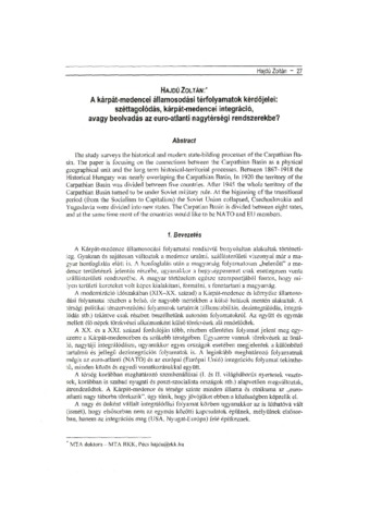 Hajdú Zoltán: A kárpát-medencei államosodási térfolyamatok kérdőjelei: széttagolódás, kárpát-medencei integráció, avagy beolvadás az euro-atlanti nagytérségi rendszerekbe? In: Közép-európai közlemények, (1) 2. pp. 28-34. (2008)
