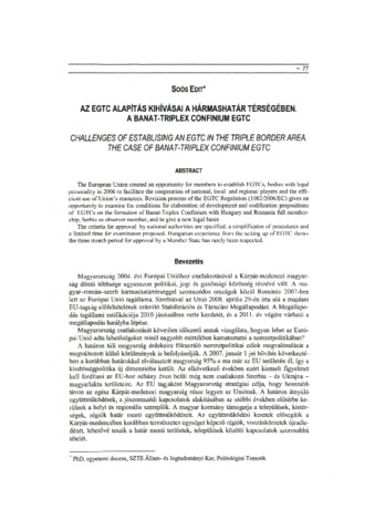 Soós Edit: Az EGTC alapítás kihívásai a hármashatár térségében : a Banat-Triplex Confinium EGTC. In: Közép-európai közlemények, (5) 2. pp. 77-87. (2012)