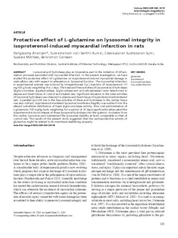 Anandan Rangasamy; Kumar Subramaniam Hari Senthil; Sumi Edakkukaran Sudhakaran; Mathew Suseela; Ganesan Balaraman: Protective effect of L-glutamine on lysosomal integrity in isopoterenol-induced myocardial infarction in rats. In: Acta biologica Szegediensis, (59) 2. pp. 205-209. (2015)