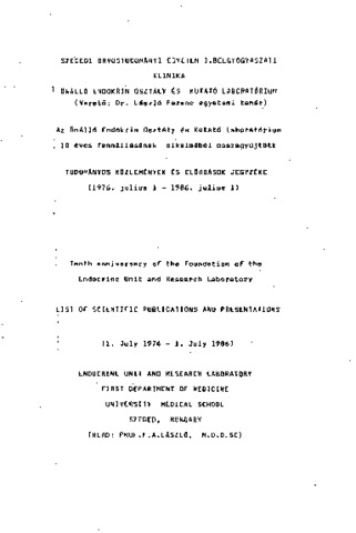 Szegedi Orvostudományi Egyetem I. Belgyógyászati Klinika Önálló Endokrin Osztály és Kutató Laboratórium 10 éves fennállásának alkalmából összegyűjtött tudományos közlemények és előadások jegyzéke : 1976. julius 1-1986. julius 1 = Tenth anniversary of the foundation of the Endocrine Unit and Research Laboratory list of scientific publications and presentations : 1. July 1976 -1. July 1986 Endocrine Unit and Research Laboratory First Department of Medicine University Medical School. (1986)