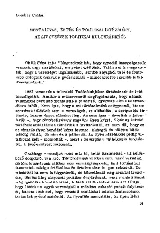 Gombár Csaba: Mentalitás, érték és politikai intézmény : megjegyzések politikai kulturánkról [!kultúránkról]. In: Közművelődés és politikai műveltség : összeállítás a TIT Szegedi XII. Művelődéselméleti Nyári Egyetemén elhangzott előadásokból, (12). pp. 93-105. (1983)