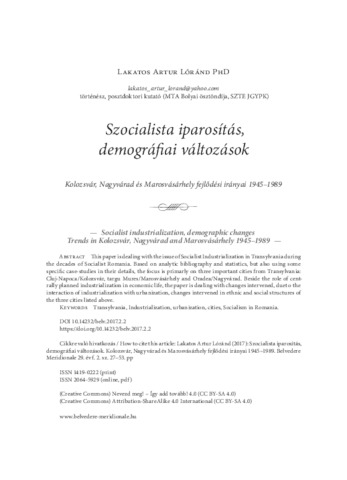Lakatos Artur Lóránd: Szocialista iparosítás, demográfiai változások : Kolozsvár, Nagyvárad és Marosvásárhely fejlődési irányai 1945-1989. In: Belvedere Meridionale, (29) 2. pp. 27-53. (2017)