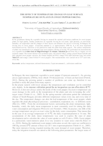 Lantos Ferenc; Pék Zoltán; Tanács Lajos; Helyes Lajos: The effect of temperature change on leaf surface temperature of plants in sweet pepper forcing. In: Review on agriculture and rural development, (2) 1. pp. 336-340. (2013)
