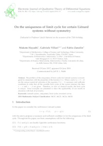 Hayashi Makoto and Villari Gabriele and Zanolin Fabio: On the uniqueness of limit cycle for certain Liénard systems without symmetry. (2018)