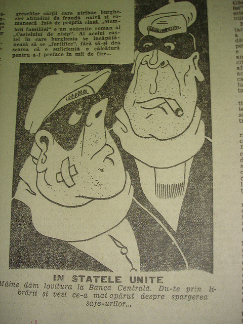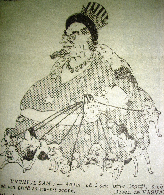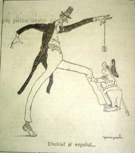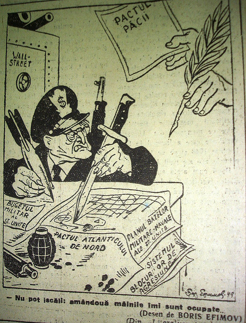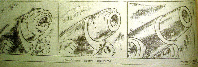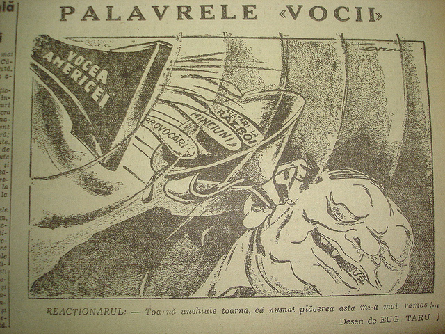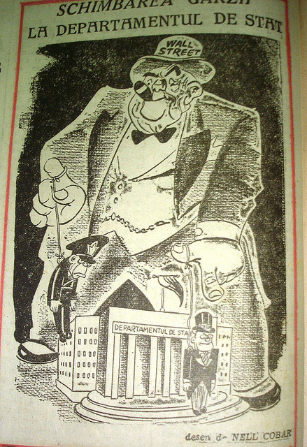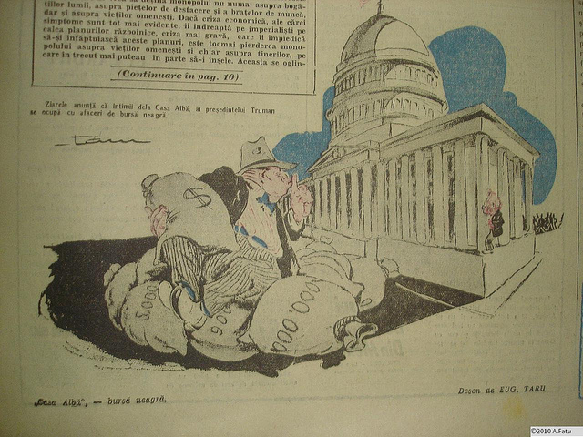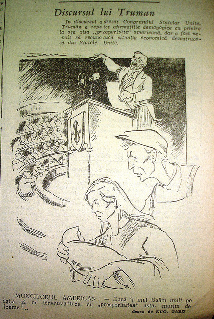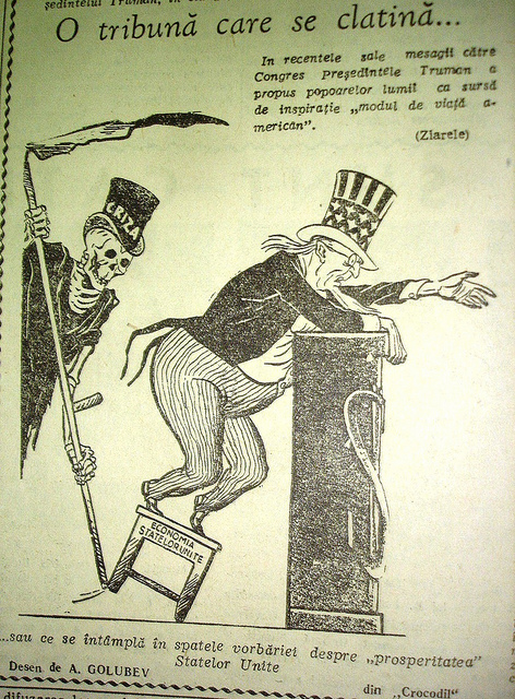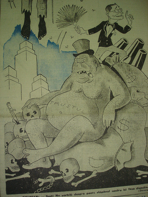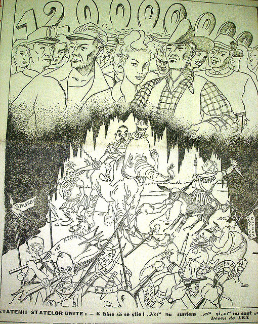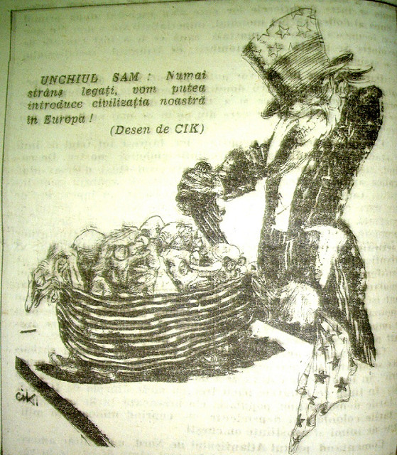 The important role played by political cartoons within propaganda (with a particular reference here to Communist Romanian propaganda from the late 1940s-early1950s) is not a minor one, as the message of such a distorted image penetrates (or at least is meant to) beyond the humorous appearance, addressing to deeper emotions and fears. Due particularly to its innocent humorous appearance, such an image comprises more than a funny message, trying to persuade and manipulate thinking in order to convince it of the regime’s own ideological truths, while all the negative energy is redirected towards an artificial, hybrid identity construct of an “imaginary” enemy. This identity construct is achieved mainly trough the insertion and recurrence of certain identity stereotypes (either imagistic, such as the flag, the Statue of Liberty or more powerful, such as the references to the financial power of the US or to imperialism).
