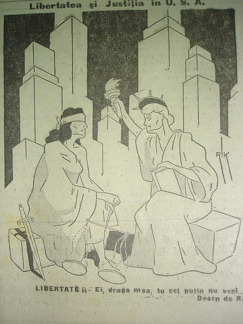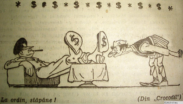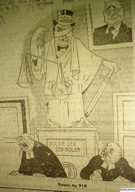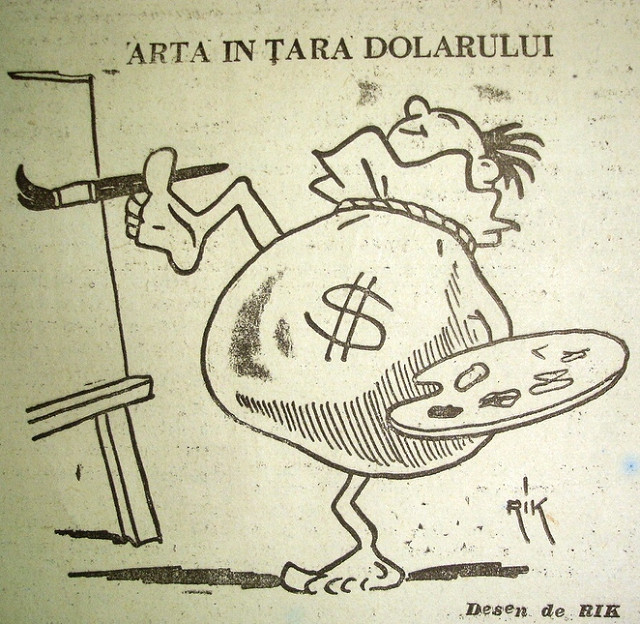 Not only justice, but also press, art, education, politics, press, justice, culture and so on are represented as subordinates of the Dollar. Paradoxically, a propaganda proclaiming ideologically engaged art and a culture (Socialist Realism, planned work, topics from the “real” proletarian life) is criticising in its caricature representations on the US, an impure art (sold to the financial god, one of the cartoons being entitled “Arta în ţara dolarului” [Art in the country of the dollar]) and a decaying culture.