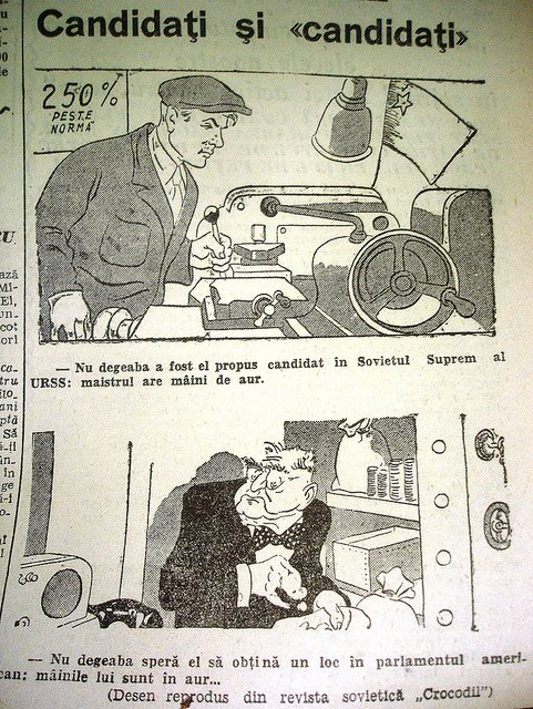 Fig. 3. Title: Candidates and “Candidates”. Text: 1. It is no accident he was named a candidate for the Supreme Soviet in URSS: the foreman has golden hands. 2. It is no accident he hopes for a place in the American parliament: he has his hands in the gold.