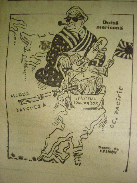 As Ştefan Borbély argues (2002, 138), the negative aspects of a conflict and particularly the atrocities of the war are always associated with the Other, the enemy, a image opposite to the complex of features “we” define as “ours”, creating the image of an (always positive) identity. This Manichean approach when defining one’s identity in opposition to another, a different one, guilty of all the disasters (especially within a military conflict) characterises human image structures (l’imaginaire) in distinct societies. This feature was exploited and stimulated in totalitarian regimes when the image of an abstract Other represented a controlled target of all the social frustrations. Press (a sort of “organ of speech” of the Power), was the channel through which the regime would transmit this political creation of the Other. Distorted par excellence by distance and difference (“the Other is most often a real person or community, observed however through the deformed filter of the imaginary [emphasis added]”, Boia, 2000, 117), the distortion is much amplified (in an intentional, very well organised manner) within totalitarian regimes. Here the information (on the Other) is, as stated below, insufficient and rationalised, while the intention is to create or redirect and then manipulate the potential negative feelings towards the Other. Functional or not within the mentioned social convention, this constructed identity of the enemy is however most interesting (in its fictionalising mechanisms) when referring to actual propaganda tools such as images in the politically controlled magazines and newspapers of the late 1940s-early1950s.