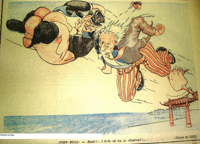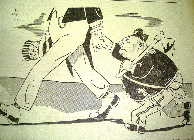 Another important feature is that, already mentioned, of these drawings being stereotypical (intentionally using a few recognisable symbols, characters and topics, although they manage to offer enough room for humour and satire). Murray J. Edelman (qtd. in Ştefan Borbély 2002: 142) implies that constructing the “enemy image” (together with the invention of a complex of social fear and xenophobia) involves a few defining stereotypes of representing the enemy. I shall focus precisely on these stereotypes. The first idea to focus on here is related to the essence of constructing an enemy and the choice of the US to embody this enemy. While in Polish press, as Joanna Witkowska, John Bull and Uncle Sam (symbolic characters which will be mentioned again below) form an alliance in the typology of the enemy, embodiments of the Evil, in Romanian political cartoons the situation is partly different. Although the two symbols appear sometimes together, US is without doubt represented (by the number of appearances, dimensions and other features) as the Number 1 enemy, while John Bull is seldom represented as an equal. Usually the British symbols (John Bull, the British pound, Churchill) are presented as subordinates or dependant to the US power, as it happens to many symbols suggesting other European powers.