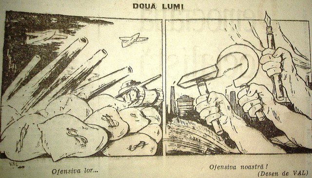 If we consider this extreme opposition proclaimed in all respects while associating the Other, the “enemy” with absolute evil, no wonder that the press controlled by the totalitarian regime fights (a press cliché of the time) against an enemy, an abstract yet complex identity well defined through a complex of stereotypes. Justified both by the Marxist-Leninist ideology and partly by the fact that we speak of a post-war period, the idea of fight was present everywhere in the late1940s-early1950s Romanian periodicals, no matter if in articles, images or literary piece of work and seems to be a constructed symbol of the “new” Communist society.