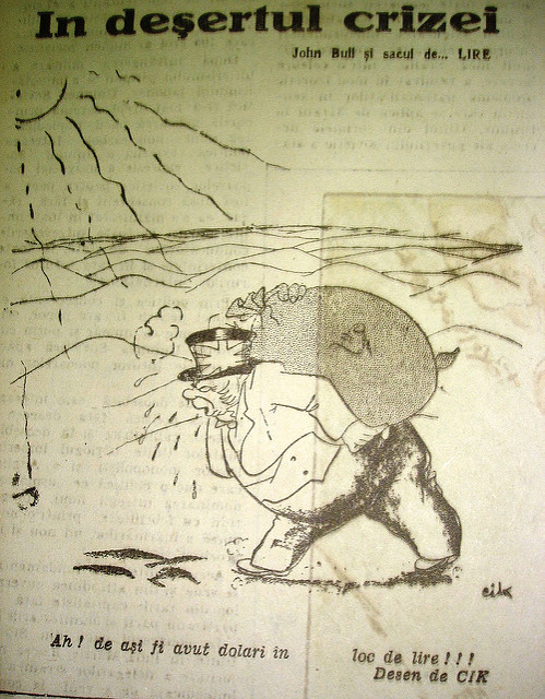 Fig. 42. Title: In the desert of crisis. John Bull and the sack of…pounds. Text: “‘If only I had dollars instead of pounds…’”