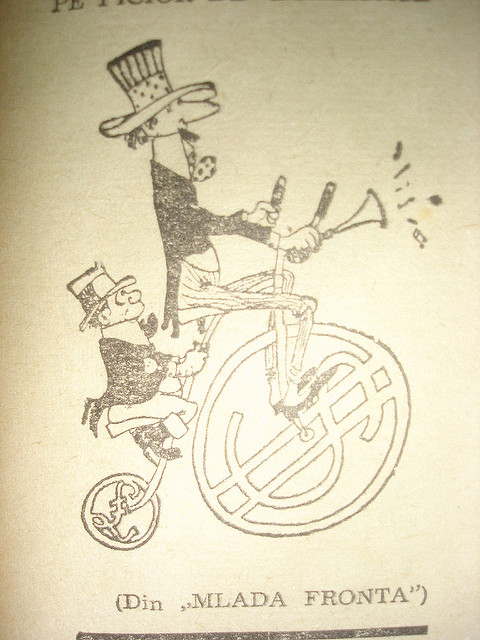 If we select only the issues which repeat most frequently (US imperialism, dollar/US as a financial power, the threat of war and Wall Street power, to count only the most representative figures), the result shows clear connections to the Cold War (then at its beginning) and what it meant, also shows which were the most important political worries in the Soviet block at the time (because the Soviet influence is obvious, sometimes the images are copied directly from URSS periodicals, as mentioned before, other times they copy characters and symbols, such as the skeleton of economic crisis or are just “in the manner of…”). Another interpretation (even more creditable in the context of the analysis above, about the intentional and complex construction of a stereotypical enemy) would be that these fears were not the actual ones at the political level, but were the ones official propaganda wanted to induce to the people (a feeling of insecurity and fear of a new war, despise towards a financially corrupted world, within which nothing is pure and creditable anymore, starting with justice, religion, art, education).