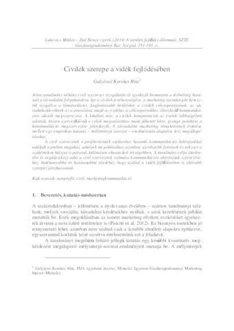 Jelen tanulmány néhány civil szervezet vizsgálatán át igyekszik bemutatni a térbeliség hatásait a társadalmi folyamatokra, így a civilek tevékenységére, a marketing szemüvegén keresztül vizsgálva a tématerületet. Legfontosabb kérdéskör a civilek célcsoportjainak, az un. stakeholdereknek az azonosítása, majd az ezekhez a célcsoportokhoz illeszkedő kommunikációs akciók megszervezése. A kínálati mix, a civilek kompetenciái az esetek többségében adottak, hiszen szerveződésük e célok megvalósítása miatt jöhetett létre, gyenge pontként a kommunikáció megszervezése jelentkezik. A társadalmi marketing témaköreinek érintése mellett egy empirikus kutatás – mélyinterjú sorozat – eredményein alapulva tesz megállapításokat. A civil szervezetek a profitorientált szektorhoz hasonló kommunikációs kihívásokkal találják szemben magukat, amelyek megoldásához azonban szerényebb források és sokszor a szakértelem hiánya is párosul, különösen elmaradott térségekben. A tanulmány célja áttekintést és segédeszközt adni a civil szervezetek számára kommunikációs aktivitásuk szervezéséhez, hatékonyabbá és hatásosabbá tételéhez, hogy ezáltal a vidék fejlődésében is aktívabb szerepet játszhassanak.