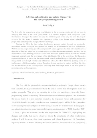 The first calls for proposals on urban rehabilitation in the new programming period are open in Hungary and some of the local governments have already prepared their Integrated Urban Development Strategies that defines not only the mid-term goals of the city, but also the projects foreseen. In this paper, I examine the experiences gained from former urban rehabilitation programmes and analyse the changes, the new era brings. Starting in 2004, the first urban development projects mainly focused on spectacular investments without strategical background and without the involvement of the local stakeholders. With the second programming period starting in 2007, a new approach has been introduced in urban planning in Hungary: cities had to prepare mid-term urban development strategies and they had to involve locals to the planning processes. From 2014, the former approach seems to continue with the integrated approach and the involvement of the inhabitants. But at the same time, the Hungarian regulations changed in a way that the counties took over the tasks of integrated planning and project management. Even though counties are subnational actors, the whole territorial planning seems to tend towards a highly-centralised system. Therefore the real question is whether and how the cities will be able to create and realize projects reflecting their own unique needs in the new system of project planning and management.