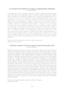 A világgazdasági válság az Európai Unión belül a kohéziós országokat erősebben sújtotta, mint a nem kohéziós régi tagállamokat. Ebben a térségben a fejlődés jobban épült a külföldi tőke bevonására, mint más feltörekvő régiókban, ami a válság alatt sebezhetőbbé tette őket. A visszaesés mértéke a válság előtt felhalmozódott egyensúlytalanságoktól függött, ezért Lengyelország, Szlovákia és Csehország növekedési kilátásai romlottak legkevésbé, Magyarország viszont kisodródott a visegrádi országok közül. Írország és a bajba jutott új kohéziós országok rugalmasabban reagáltak a válságra, mint a mediterrán országok. A növekedési potenciál szempontjából kulcsterületeken a kohéziós országok nagyobb visszaesést, illetve megszorításokat szenvednek el, mint az északnyugati centrum országok, ami alátámasztja a konvergencia lassulását előrejelző ökonometriai elemzéseket. Mindez az integráció eddigi koncepciójának az újragondolását is kikényszeríti, aminek központi eleme volt a szegényebb országok gyors felzárkózásának elősegítése. Ehelyett egy olyan integrációval kell számolni, amelyben a növekedés jobban épül a belső megtakarításra, a kohéziós támogatás inkább szolgálja a válság következményeinek enyhítését, mint az eddigi gyors konvergencia folytatását. Az Európai Unió legfőbb előnye az lehet, hogy az európai nemzetgazdaságok együttese világgazdasági tényező tud maradni, ami integráció nélkül nem lehetséges. Within the European Union, the economic crisis impacted more severely the old and new cohesion countries than the other old member states. During the crisis the cohesion countries became more vulnerable as their development had been driven more significantly by foreign investment comparing it to other emerging regions. The degree of downturn depended on the imbalances, which had been accumulated prior to the crisis. That is the reason why the growth perspectives of Poland, Slovakia and the Czech Republic comparing it to other cohesion countries have declined less. Hungary has drifted out of the Visegrád countries. Ireland and the new cohesion countries, which were hit seriously, reacted to the crisis more flexibly than the Mediterranean countries. Despite of that, it is presumable that the quick convergence of the cohesion countries prior to the crisis will not return even in medium term. In key areas concerning the economic growth potential the cohesion countries suffer from more serious austerity measures in contrast to the north-western countries. Several econometric projections forecast the slowdown of convergence, which represents a challenge to the concept of the European integration. This situation forces the rethinking of the current concept of integration which is based on the quick catching-up of the poorer countries. Instead of this, we have to count with integration where the economic growth is built on domestic savings to a higher degree. The most important advantage of the EU may be that the group of European national economies can remain a decisive actor in the world economy that would be impossible without integration.