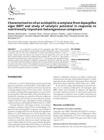 Mukherjee Riddha; Paul Tanmay; Halder Suman Kumar; Soren Jyoti Prakash; Banerjee Amrita; Mondal Keshab Chandra; Pati Bikash Ranjan; Mohapatra Pradeep Kumar Das: Characterization of an acidophilic α-amylase from Aspergillus niger RBP7 and study of catalytic potential in response to nutritionally important heterogeneous compound. In: Acta biologica Szegediensis, (62) 1. pp. 75-82. (2018)