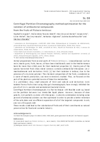 Grougnet Raphaël; Tavares Botelli Maíra Islena; Lecsö-Bornet Marylin; Ortiz Sergio; Michel Sylvie; Smyrnioudis Ilias; Aligiannis Nektarios; Boutefnouchet Sabrina; Kritsanida Marina: Centrifugal Partition Chromatography method optimization for the isolation of antibacterial compounds from the fruits of Pistacia lentiscus : [abstract].
