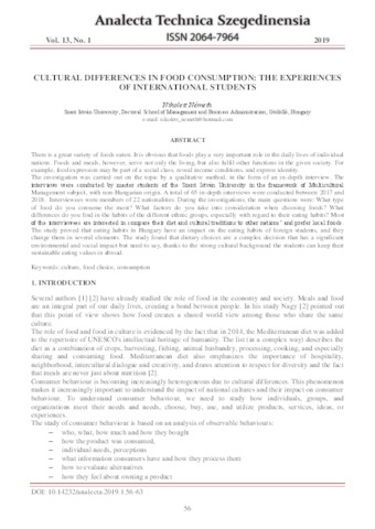 Németh Nikolett: Cultural differences in food consumption : the experiences of international students. In: Analecta technica Szegedinensia, (13) 1. pp. 56-63. (2019)