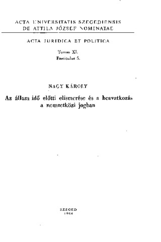 Nagy Károly: Az állam idő előtti elismerése és a beavatkozás a nemzetközi jogban. In: Acta Universitatis Szegediensis : acta juridica et politica, (11) 5. pp. 1-32. (1964)