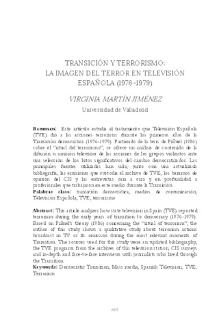 Martín Jiménez Virginia: Transición y terrorismo : la imagen del terror en televisión Española, 1976-1979. In: Transiciones de la dictadura a la democracia. pp. 603-635. (2016)