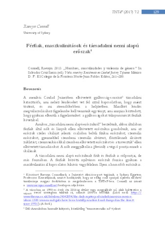 Connell Raewyn: Férfiak, maszkulinitások és társadalmi nemi alapú erőszak. In: Társadalmi Nemek Tudománya Interdiszciplináris eFolyóirat, (7) 2. pp. 129-142. (2017)
