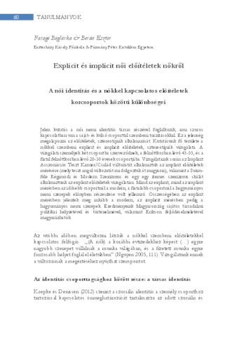 Faragó Boglárka and Berán Eszter: Explicit és implicit női előítéletek nőkről : a női identitás és a nőkkel kapcsolatos előítéletek korcsoportok közötti különbségei. In: Társadalmi Nemek Tudománya Interdiszciplináris eFolyóirat, (5) 2. pp. 60-82. (2015)
