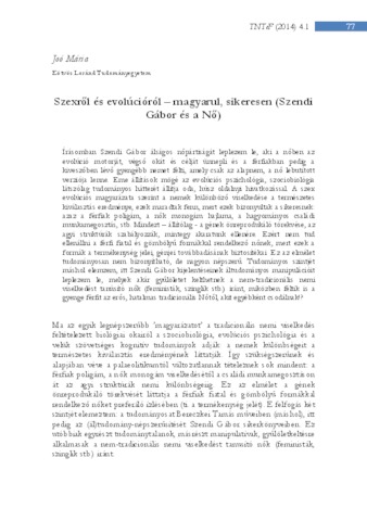 Joó Mária: Szexről és evolúcióról : magyarul, sikeresen - Szendi Gábor és a Nő. In: Társadalmi Nemek Tudománya Interdiszciplináris eFolyóirat, (4) 1. pp. 77-96. (2014)