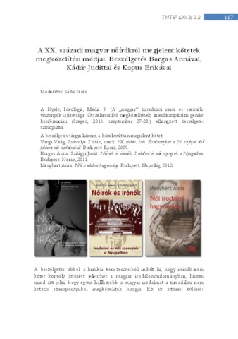 Séllei Nóra and Kérchy Anna: A XX. századi magyar nőírókról megjelent kötetek megközelítési módjai : beszélgetés Borgos Annával, Kádár Judittal és Kapus Erikával. In: Társadalmi Nemek Tudománya Interdiszciplináris eFolyóirat, (3) 2. pp. 117-120. (2013)