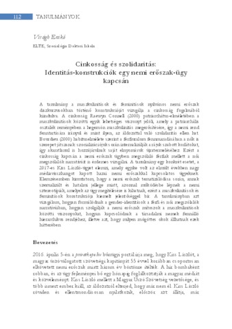 Virágh Enikő: Cinkosság és szolidaritás : identitás-konstrukciók egy nemi erőszak-ügy kapcsán. In: Társadalmi Nemek Tudománya Interdiszciplináris eFolyóirat, (9) 1. pp. 112-131. (2019)
