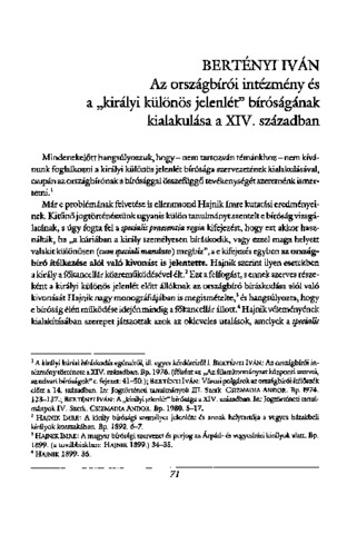 Bertényi Iván: Az országbírói intézmény és a "királyi különös jelenlét" bíróságának kialakulása a XTV. században. In: Magyaroknak eleiről : ünnepi tanulmányok a hatvan esztendős Makk Ferenc tiszteletére. pp. 71-82. (2000)
