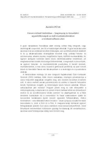 Alabán Péter: Három évtized távlatában - szegénység és társadalmi egyenlőtlenségek az ózdi munkáskolóniákon a rendszerváltozás után : [absztrakt].