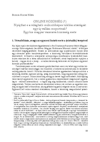 Bodosi-Kocsis Nóra: Online közösség (?) : nyújthat-e a világháló működőképes túlélési stratégiát egy új vallási csoportnak? : egy kis magyar vaisnava közösség esete. In: Lelkiségek, lelkiségi mozgalmak Magyarországon és Kelet-Közép Európában = Spirituality and spiritual movements in Hungary and Eastern Europe 10. pp. 83-99. (2014)