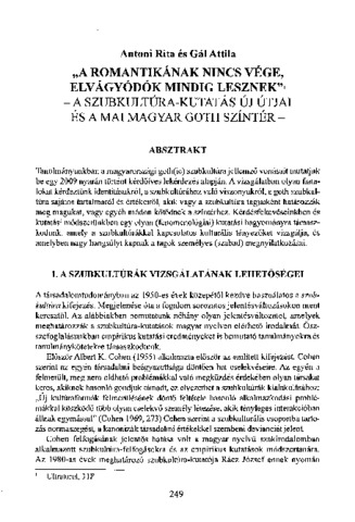 Antoni Rita; Gál Attila: "A romantikának nincs vége, elvágyódok mindig lesznek" : a szubkultúra-kutatás új útjai és a mai magyar goth színtér. In: Pillanatfelvételek a Kárpát-medencei ifjúságról. pp. 249-265. (2009)