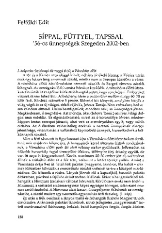 Felföldi Edit: Síppal, füttyel, tapssal : '56-os ünnepségek Szegeden 2002-ben. In: 1956, emlékezés és emlékezet : október 23-a megünneplése és a forradalom történelmi emlékezetének megszerkesztése napjainkban : egy kutatószeminárium tanulságai, (17). pp. 138-147. (2006)