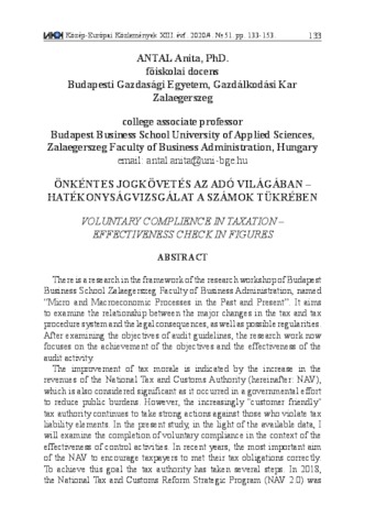 Antal Anita: Önkéntes jogkövetés az adó világában : hatékonyságvizsgálat a számok tükrében. In: Közép-európai közlemények, (13) 4. pp. 133-153. (2020)