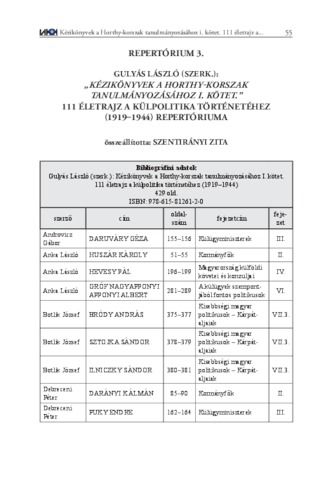 Szentirányi Zita: Repertórium 3. : "Kézikönyvek a Horthy-korszak tanulmányozásához I. kötet." : 111 életrajz a külpolitika történetéhez (1919-1944) repertóriuma. In: A Horthy-korszakról az értékteremtő történetírás jegyében : az újragondolt negyedszázad konferenciasorozat : áttekintés és tanulmányok, (30). pp. 55-61. (2021)