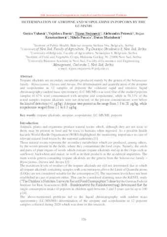 Vuković Gorica; Bursić Vojislava; Stojanović Tijana; Petrović Aleksandra; Konstantinović Bojan; Puvača Nikola; Marinković Dušan: Determination of atropine and scopolamine in popcorn by the LC-MS/MS.