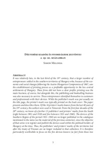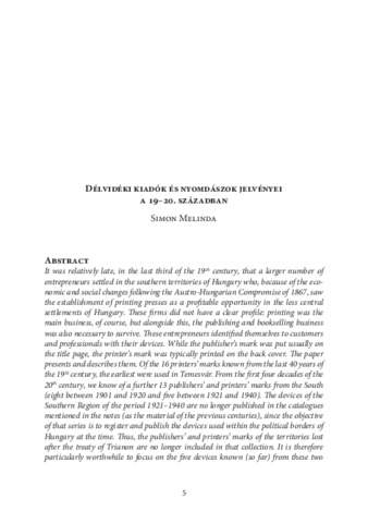 It was relatively late, in the last third of the 19th century, that a larger number of entrepreneurs settled in the southern territories of Hungary who, because of the economic and social changes following the Austro-Hungarian Compromise of 1867, saw the establishment of printing presses as a profitable opportunity in the less central settlements of Hungary. These firms did not have a clear profile: printing was the main business, of course, but alongside this, the publishing and bookselling business was also necessary to survive. These entrepreneurs identified themselves to customers and professionals with their devices. While the publisher’s mark was put usually on the title page, the printer’s mark was typically printed on the back cover. The paper presents and describes them. Of the 16 printers’ marks known from the last 40 years of the 19th century, the earliest were used in Temesvár. From the first four decades of the 20th century, we know of a further 13 publishers’ and printers’ marks from the South (eight between 1901 and 1920 and five between 1921 and 1940). The devices of the Southern Region of the period 1921–1940 are no longer published in the catalogues mentioned in the notes (as the material of the previous centuries), since the objective of that series is to register and publish the devices used within the political borders of Hungary at the time. Thus, the publishers’ and printers’ marks of the territories lost after the treaty of Trianon are no longer included in that collection. It is therefore particularly worthwhile to focus on the five devices known (so far) from these two decades. In the end three devices from the decades between 1941 and 1989 are presented. In this period, in addition to the well-known and traditional symbolism, an exciting phenomenon emerged: the appearance of ideological and political symbols which had hitherto been missing from the world of publishers’ and printers’ marks.