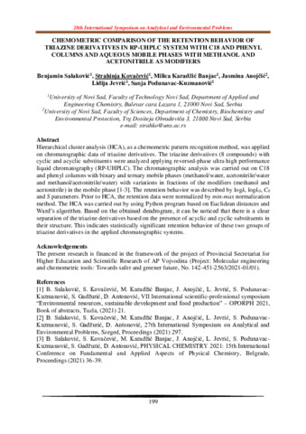 Salaković Benjamin; Kovačević Strahinja; Karadžić Banjac Milica; Anojčić Jasmina; Jevrić Lidija; Podunavac-Kuzmanović Sanja: Chemometric comparison of the retention behavior of triazine derivatives in RP-UHPLC system with C18 and phenyl columns and aqueous mobile phases with methanol and acetonitrile as modifiers : [abstract].