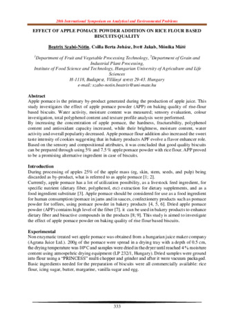 Szabó-Nótin Beatrix; Berta Juhász Csilla; Jakab Ivett; Máté Mónika: Effect of apple pomace powder addition on rice flour based biscuits quality.