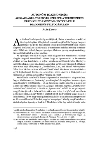 Paár Tamás: Autonóm igazmondás : az igazságra törekvés szerepe a természetes erkölcsi törvény MacIntyre-féle dialogikus felfogásában. In: A vita : Heller Ágnes emlékére, (19). pp. 248-254. (2022)