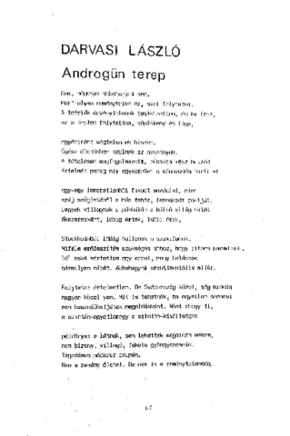 Darvasi László: Androgün terep ; Androgün terep : [versek]. In: Harmadkor 7. pp. 67-68. (1987)
