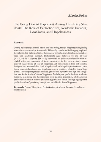 Dobos Bianka: Exploring fear of happiness among university students: the role of perfectionism, academic burnout, loneliness, and hopelessness : [abstract].