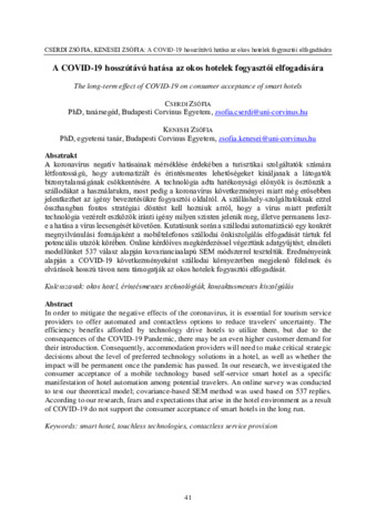 Cserdi Zsófia; Kenesei Zsófia: A COVID-19 hosszútávú hatása az okos hotelek fogyasztói elfogadására = The long-term effect of COVID-19 on consumer acceptance of smart hotels : [absztrakt].