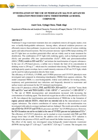 Čovic Anett; Orosz Gyöngyi; Alapi Tünde: Investigation of the use of persulfate salts in advanced oxidation processes using trimethoprim as model compound : [abstract].